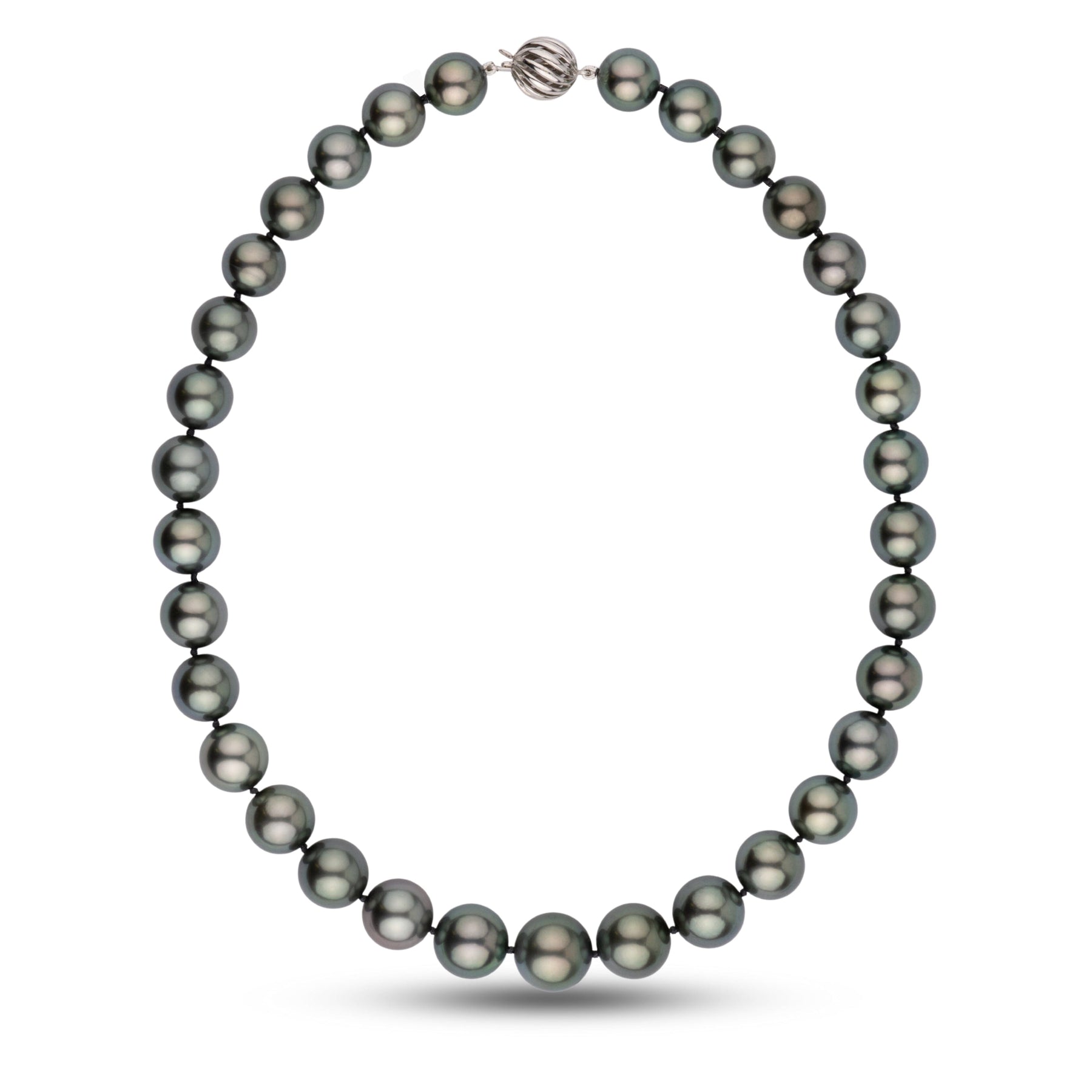 This AAA Tahitian necklace features 33 round pearls measuring 11.1 to 13.9 mm with a total weight of 20.8 momme. The strand has a dark intense green bodycolor with subtle peacock overtones and intensely sharp luster. The surfaces are clean and the matching is strong, giving the strand a refined, cohesive look.