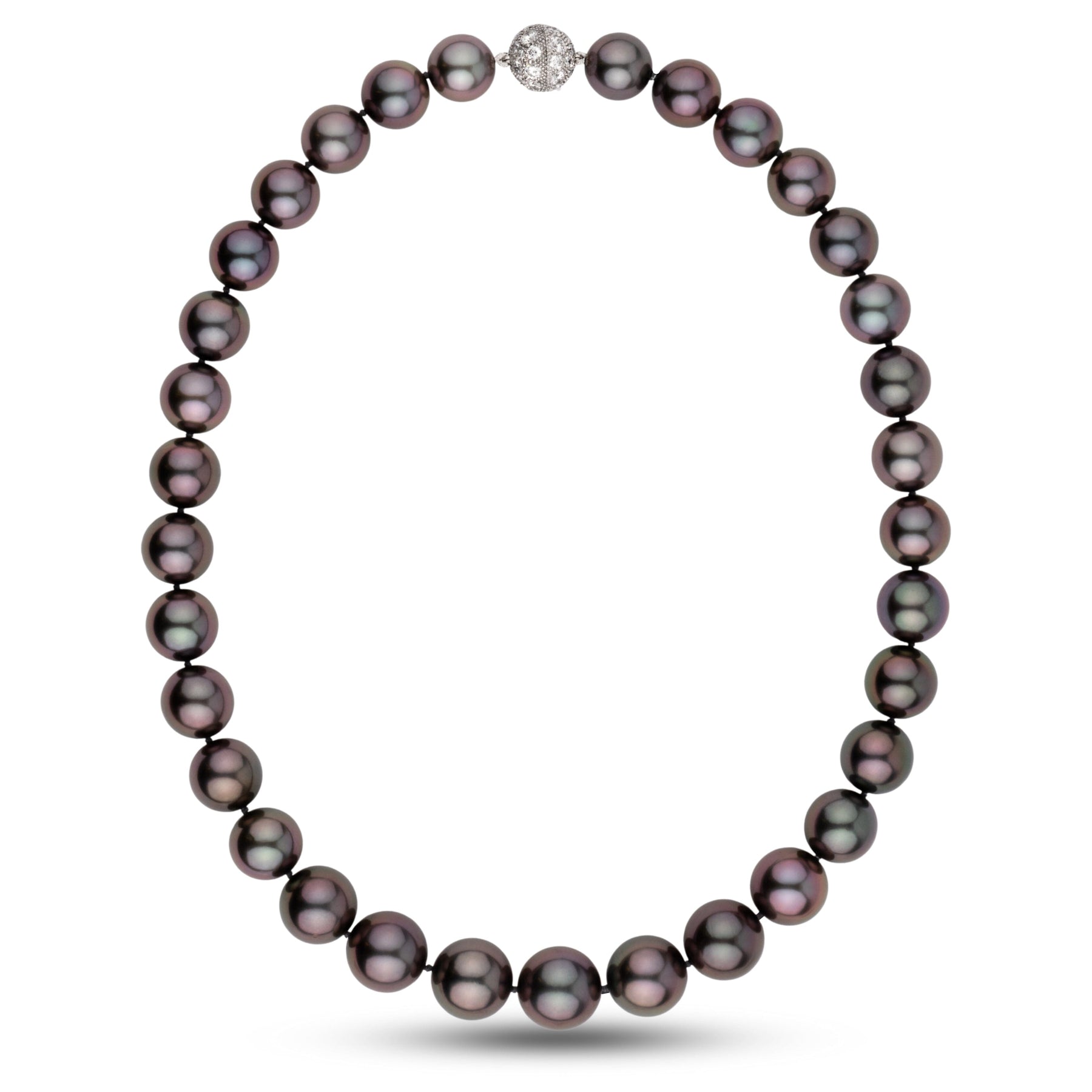 The necklace measures 18 inches and is finished with a platinum and 18k white gold clasp set with 40 diamonds totaling 3.00 carats. It is hand knotted on silk.