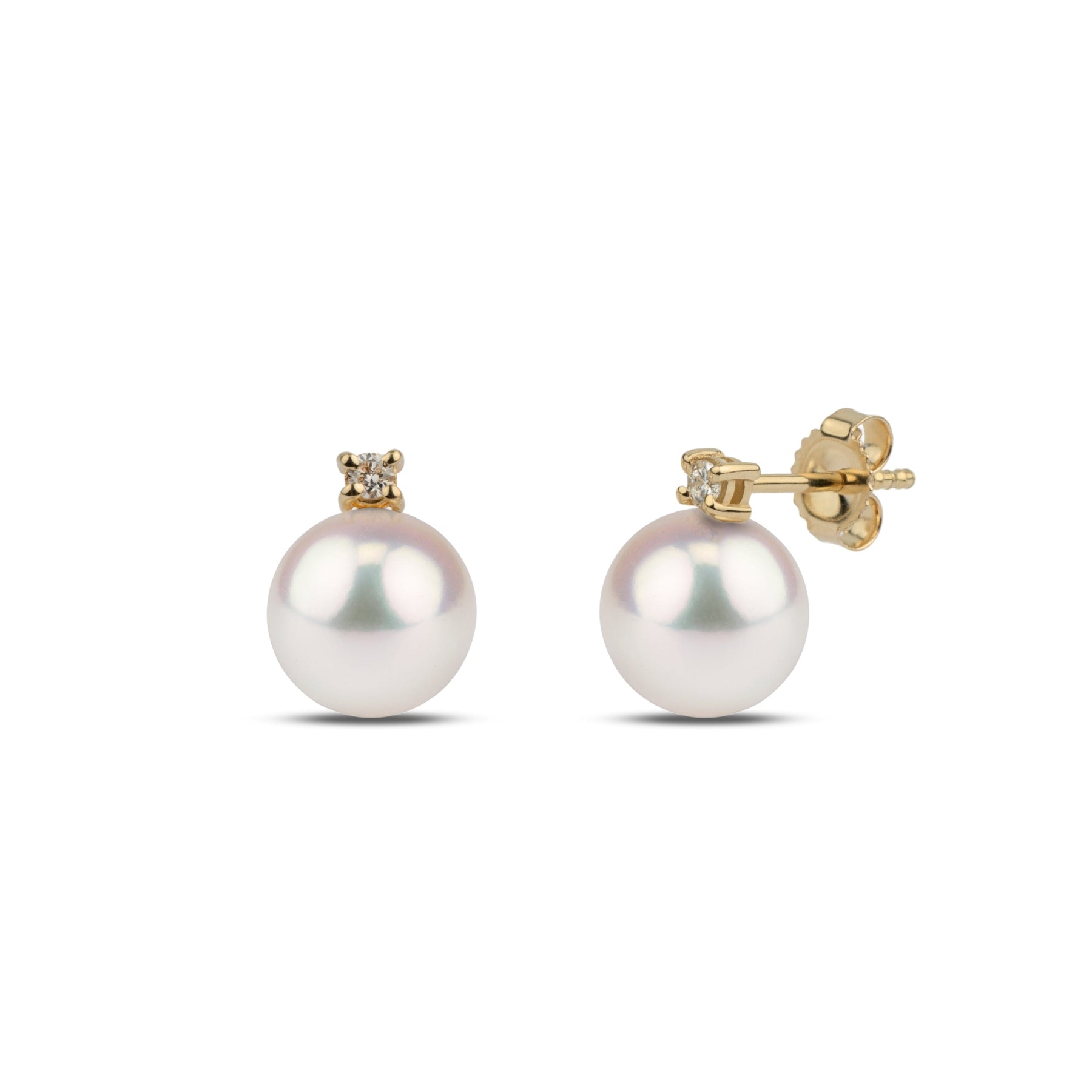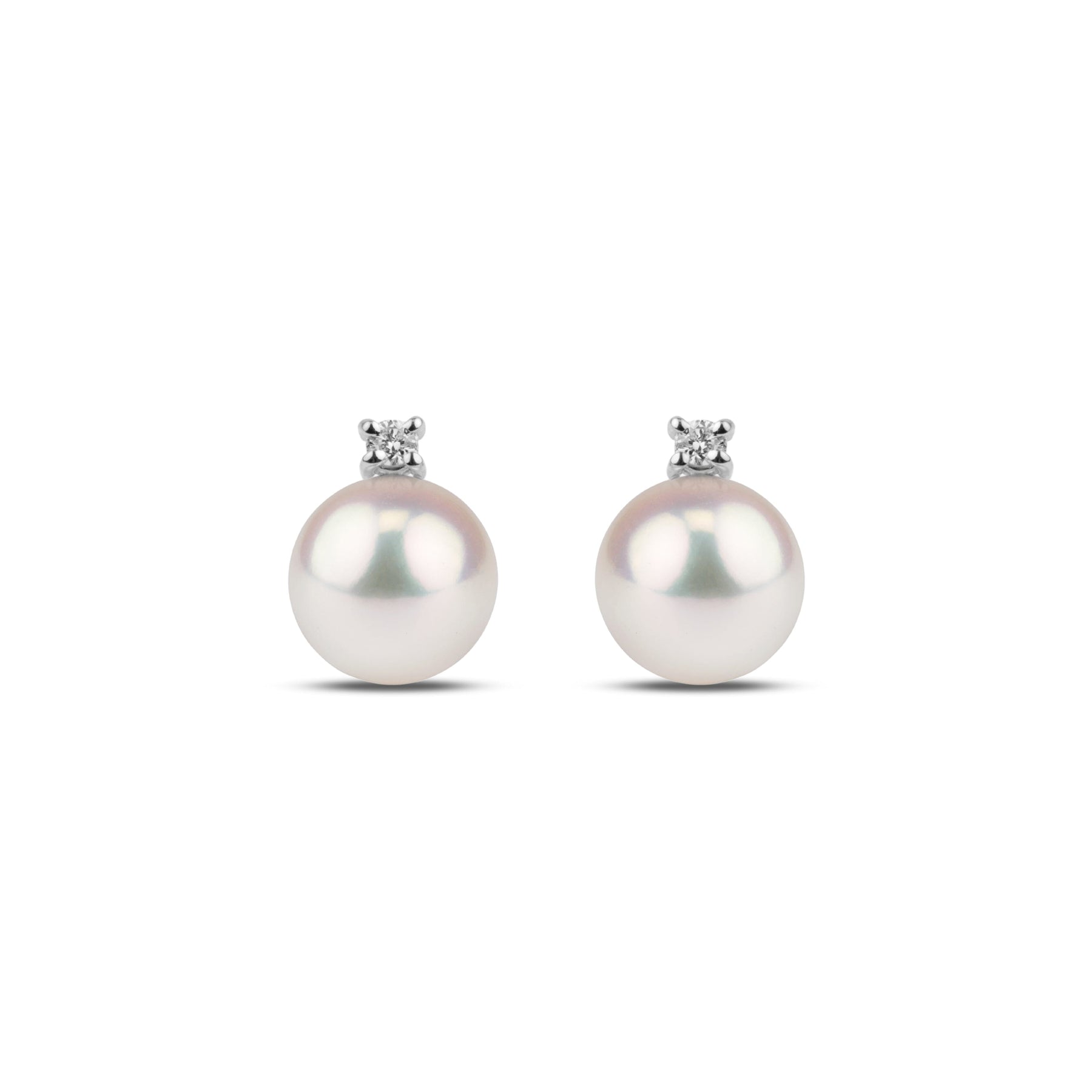 These exquisite earrings feature two perfectly round, white Akoya pearls mounted on 14-karat gold posts with two sparkling, brilliant round-cut, prong-set diamonds. This elegant set of AAA quality, 8.5-9.0 mm pearls has brilliant luster, a mirror-like reflection, and a perfectly smooth surface.