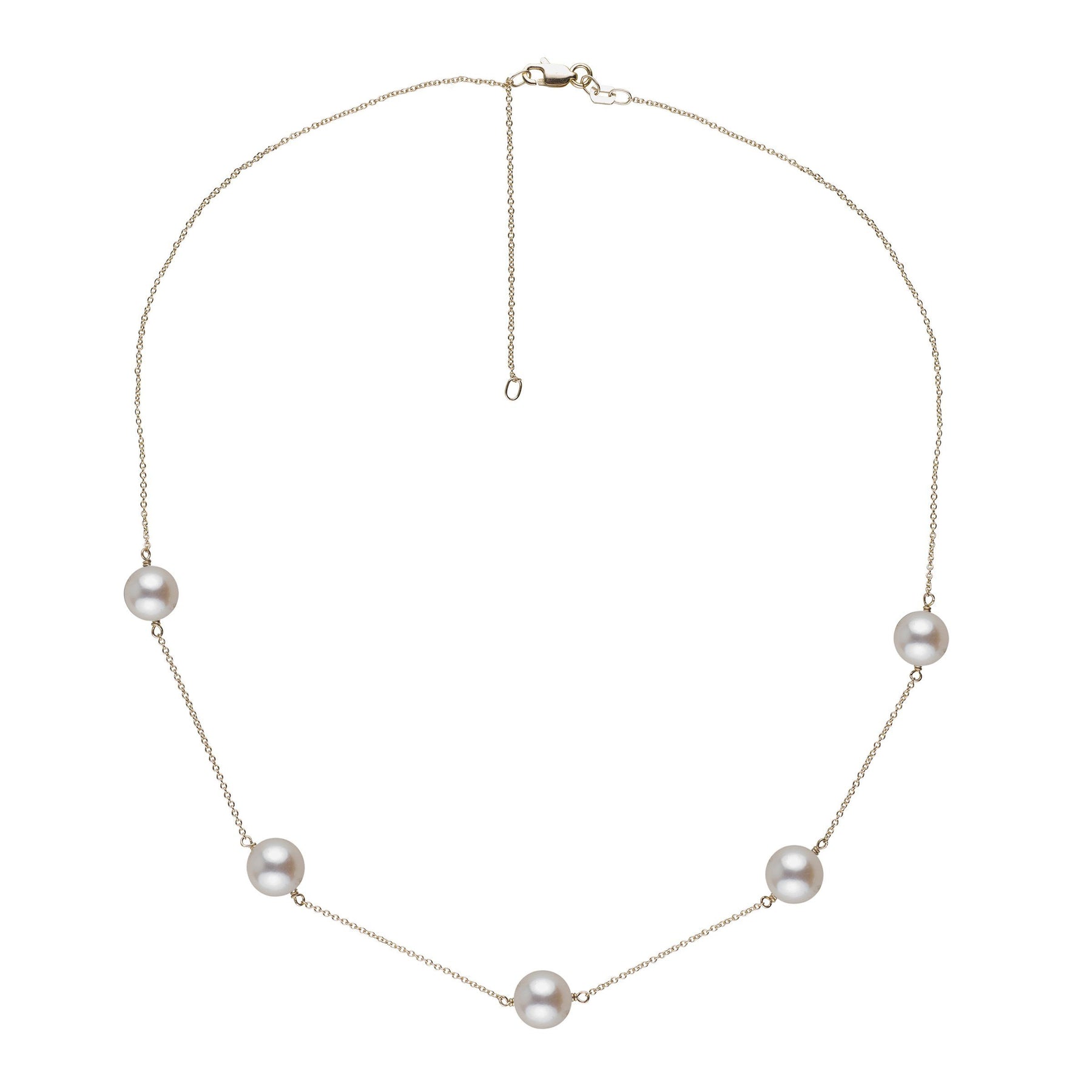 This necklace is crafted with five lustrous 7.5-8.0 mm AAA Akoya Pearls on a 14k gold fine cable chain with lobster clasp closure.
