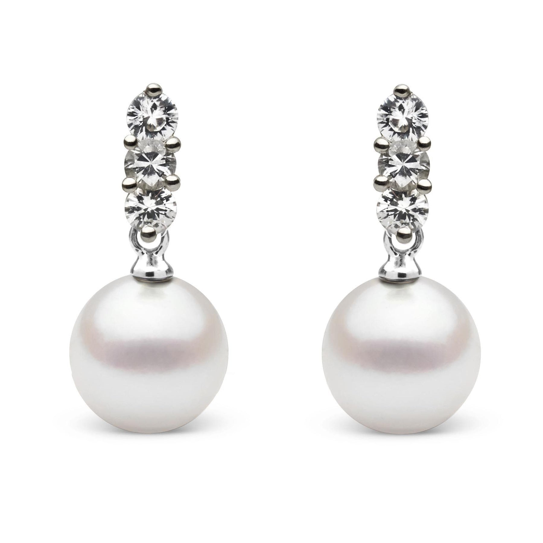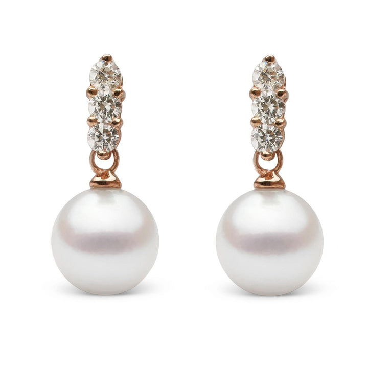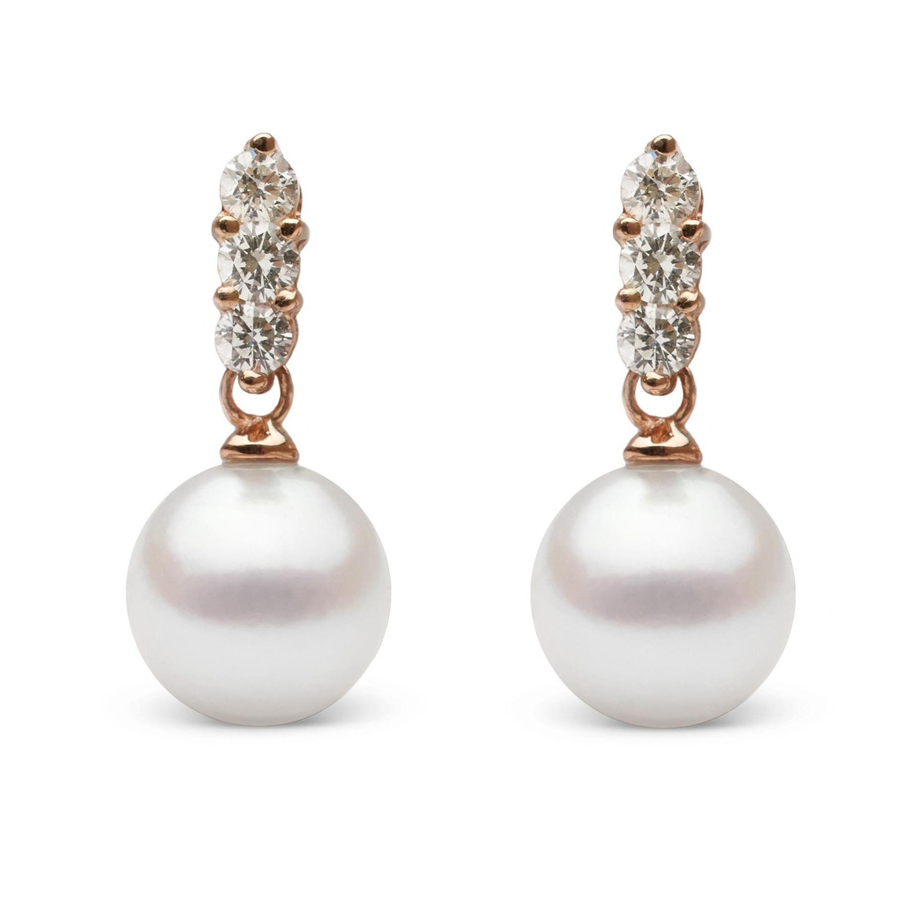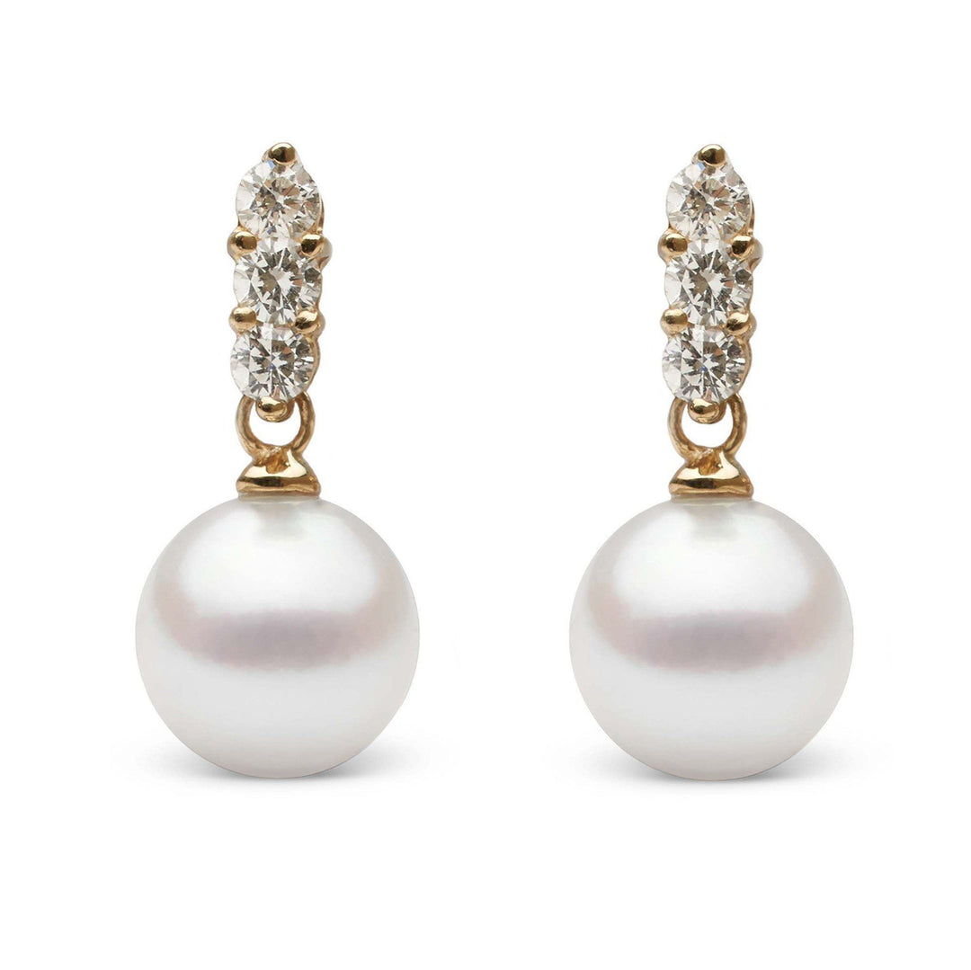 With three sparkling diamonds adorning each 8.5-9.0 mm Akoya pearl, our Trio Collection earrings will impress even the most discerning pearl connoisseur. The high quality G-VS1 diamonds have a total weight of 0.40 carats, and are masterfully set in your choice of 14 karat yellow, white or rose gold settings.